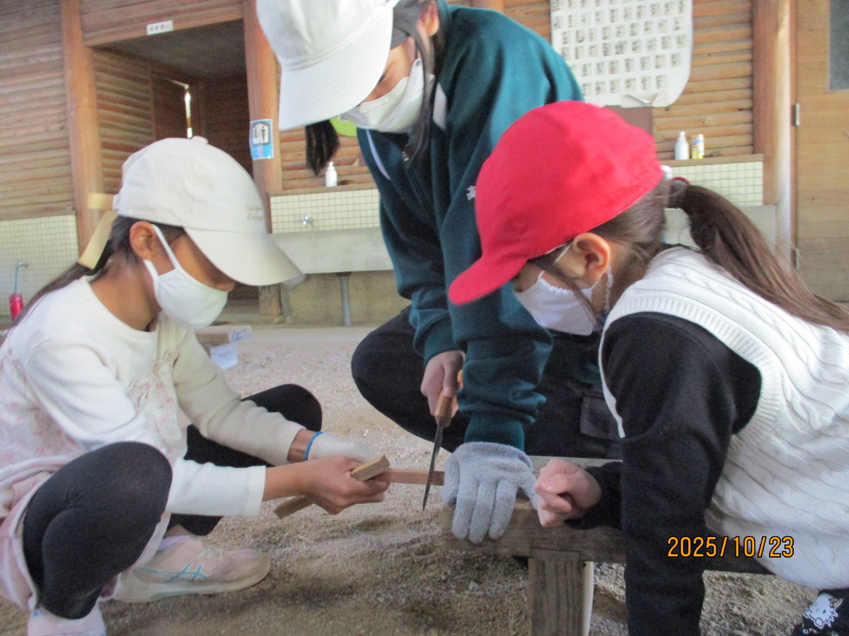10月に1泊2日やまのこ学習に行きました。やまのこ学習では、森林が空気をきれいにしてくれたり、土砂災害から守ってくれたりする仕組みについて学びました。また、森林を活かし続けるための間伐についても詳しく学びました。そして、間伐材を使用したスプーン作りを行い、間伐材を活用することの大切さを知りました。二日目の朝起きて、部屋の外を見ると鹿がいて驚きましたが、野生の鹿を近くで見られて嬉しかったです。
