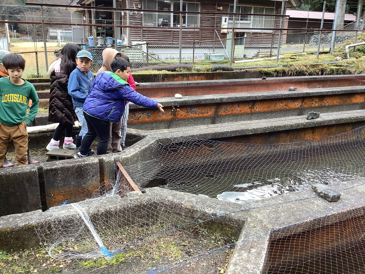 12月、魚の育て方を知りたくて、葛川漁協へ出かけました。そこで育てられているのは、アマゴ、イワナ、アユでした。魚を育てる水は、明王谷からひいているそうです。その水道管は50年以上前に作られたと聞いて、昔の人はすごいなと思いました。また、大切に育てている魚を鳥から守るために、池の上に糸を張っておられました。魚を育てるのは簡単じゃないと分かりました。
